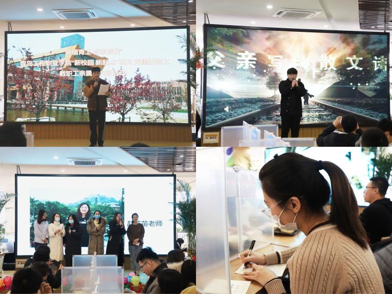 在新餐厅,播放了学院宣传片和信息工程学院、基础教研部纪实短片,全方位展现学院建设和发展成绩;教职工和学生为亲属奉献精彩的才艺表演,纤歌缭绕、曼妙蹁跹,无不展现学院师生的活力和风采,无不彰显莘莘学子崭新的青春风貌。当然,欣赏之余,亲属们也共飨尚“食”,体验了新餐厅丰富多彩的美食。诉说正启,源远流长,亲属们将想说的话写于书笺,在微寒之冬聊赠一枝春,让学院风华与教师风采在如诗的扉页中芳菲。