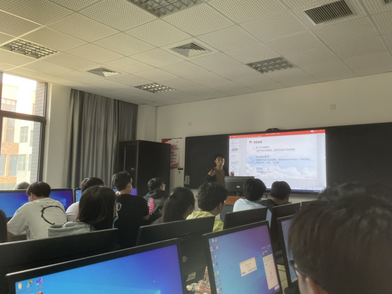 在云桌面实训室,郭阳工程师首先向软件技术专业的学生们介绍了传统软件开发流程,对比了瀑布模式和敏捷开发的优缺点,引出新一代软件开发平台DevCloud,并现场演示了云端进行项目管理、代码托管、流水线、代码检查、编译构建、部署、测试、发布等功能应用。在演示过程中,软件技术专业的同学们沉浸式体验到了真实的工作任务场景,加深了对DevCloud软件开发平台的认识,同时更加熟悉软件开发的主要流程,拓宽了软件开发应用领域的视野。