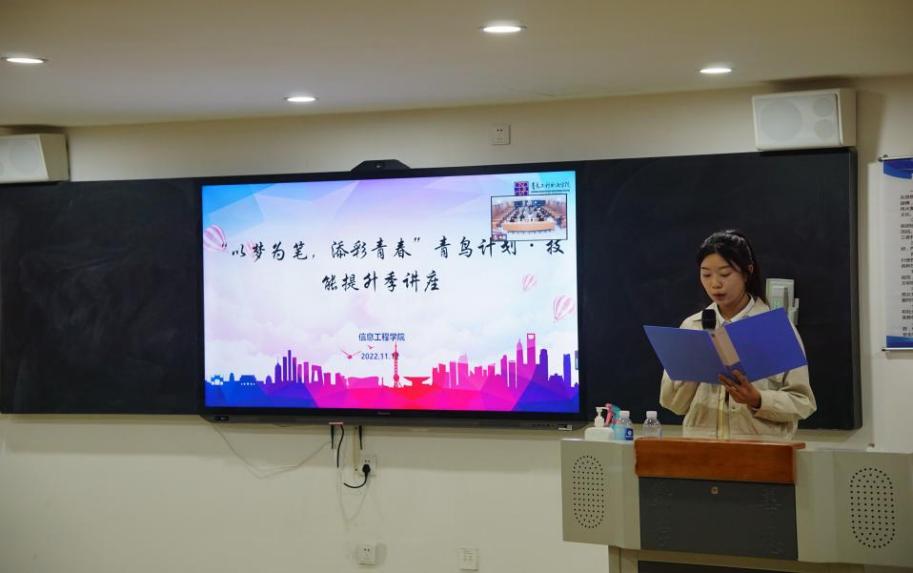 为了深入学习宣传贯彻党的二十大精神,响应团市委“青鸟计划·技能提升季”工作方案要求,引导学生树立正确就业观念,培养创新创业精神,11月13日,信息工程学院在致一楼102阶梯教室举办 “以梦为笔,添彩青春”青鸟计划·技能提升季宣讲活动。