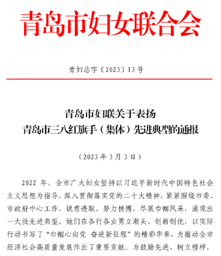 万物复苏春风暖,巾帼花开别样红。近日,青岛市妇联下发《关于表扬青岛市三八红旗手(集体)先进典型的通报》,青岛工程职业学院信息工程学院喜获2022年度“青岛市三八红旗集体”荣誉称号。