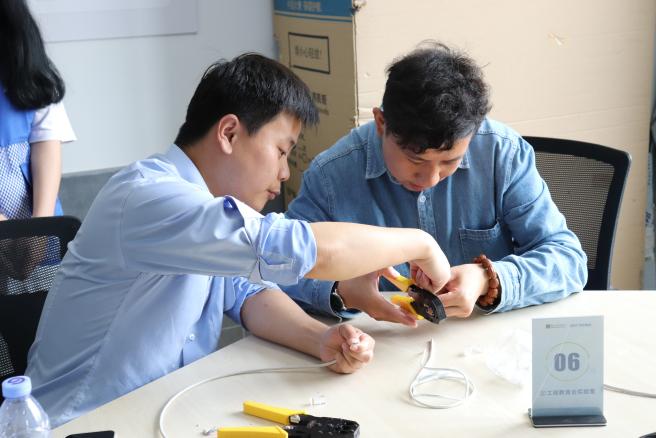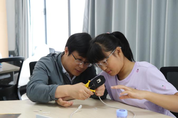 教职工与亲属们到达信息工程学院工程教育云实验室进行双绞线趣味制作活动,在任红霞老师的指导下,大家认真进行剥线、理线、插线、压线、测线,每个家庭共同合作完成了双绞线的制作。