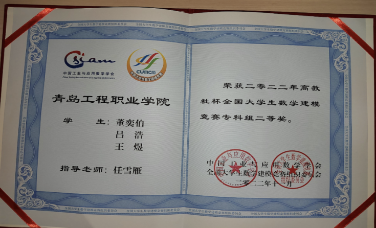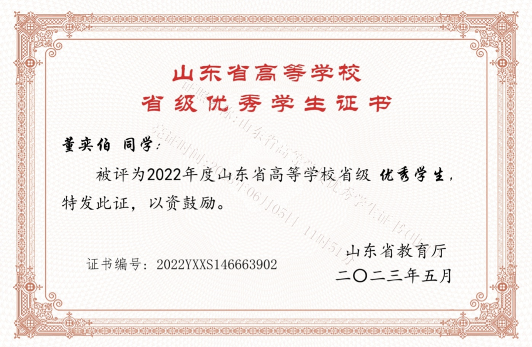 获得荣誉:全国数学建模大赛国家二等奖、山东省优秀学生、山东省科技节大赛企业网赛道三等奖、青岛市中小学生超体重学生“健康夏令营”志愿者、青岛市无偿献血“爱心大学生”、青岛工程职业学院一等奖学金、七天疯狂阅读挑战赛校级一等奖、华为HCIA-Datacom证书、华为HCCDA-AI证书。