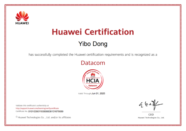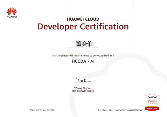 2022年5月,董奕伯努力学习华为数通的网络基础、IP地址知识、静态动态路由、交换机、路由器、生成树协议以及ENSP软件的配置等知识,认真完成课上培训,课下模拟训练无数次,顺利考取了华为HCIA-Datacom初级证书。2022年11月,他加强对华为的人工智能和华为云平台的学习,主要包括图像标签识别、ModelArts服务应用、HiLens服务应用以及文字识别等,顺利考取了华为HCCDA-AI初级证书。