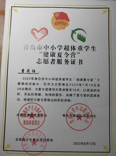 2022年暑假,董奕伯主动参加青岛市中小学生超体重学生“健康夏令营”志愿者活动,顺利帮助15位学生减重,减重超过1kg的有8人。通过这次志愿者活动,他感受到志愿者身份的光荣和使命所在,深刻体会到了“奉献、友爱、互助、进步”的志愿者精神,活动结束后获得青岛市中小学生超体重学生“健康夏令营”志愿者证书。作为青年志愿者能够凭微薄之力帮助别人,他感到无比自豪,并表示要在志愿者这条路上继续前行。