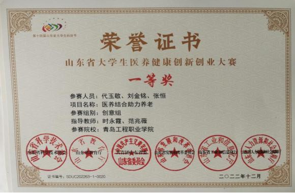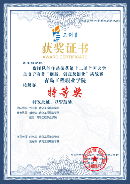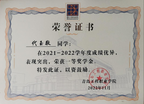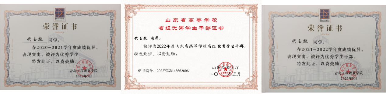 代玉敬,男,共青团员,信息工程学院2021级信息安全技术应用2班学生,现任信息工程学院学生会主席,班级班长等职务,先后获得省级优秀学生干部、校级优秀学生、校一等奖学金等诸多荣誉,荣获第十四届山东省大学生科技节“金德杯”医养健康创新创业大赛省级一等奖,第十二届全国大学生电子商务“创新、创意及创业”大赛校级特等奖,第九届山东省“互联网+”大学生创新创业大赛暨第九届中国国际“互联网+”大学生创新创业大赛校赛第二名、青岛工程职业学院第十八届“挑战杯”全国大学生课外学术科技作品竞赛校赛第四名,并参与教育部高等学校科学研究发展中心的中国高校产学研创新基金项目。
