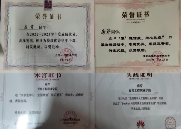 随着学习成绩的提升,房芹同学的心态也更加从容坚定了,魏秋怡老师开始鼓励她积极参加学校的各项活动,并向党组织靠拢。房芹同学听取了老师的建议,加入了青马培训工程且顺利通过结业考试,并且还递交了入党申请书,认真学习党的重要思想,积极向党组织靠拢。作为班内的团支书,她积极配合辅导员老师及班长的工作,有条不紊的组织班级各项活动的开展,先后带领大家完成多次团课学习,团日活动,给大家讲解相关知识,带领同学们观看有关视频。课余时间,也会及时为同学们答疑解惑。在房芹同学的努力下,大一学期末她荣获了院级及校级优秀学生干部的称号。“看到她脸上自信的光芒,心里真为她高兴”,魏秋怡老师如是说。