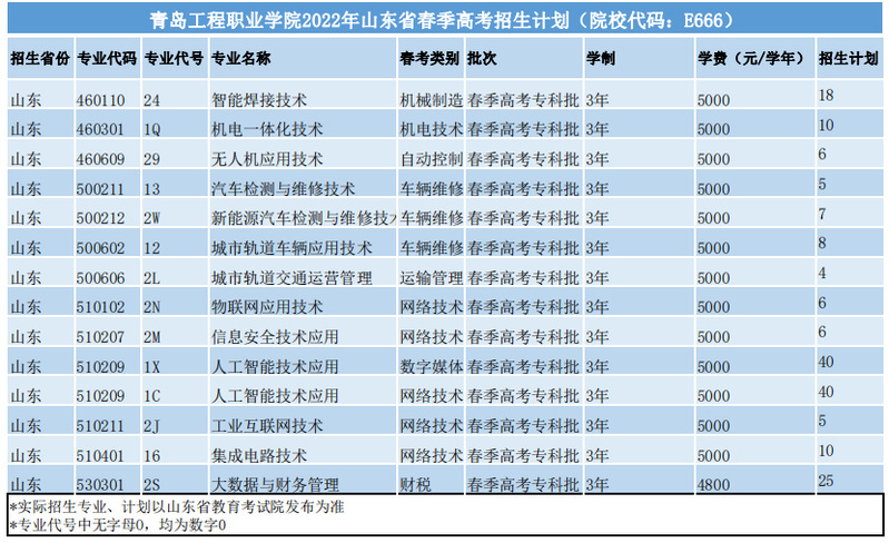 青岛工程职业学院2022年山东省招生计划(春季高考)