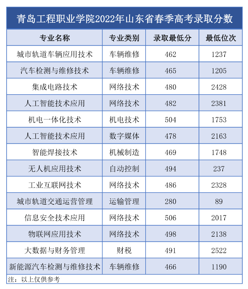 青岛工程职业学院2022年春季高考录取分数