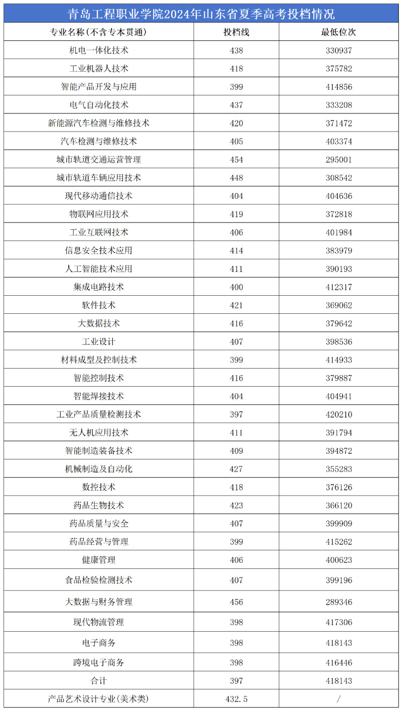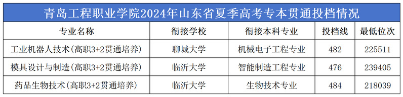 青岛工程职业学院2024年山东省夏季高考投档情况