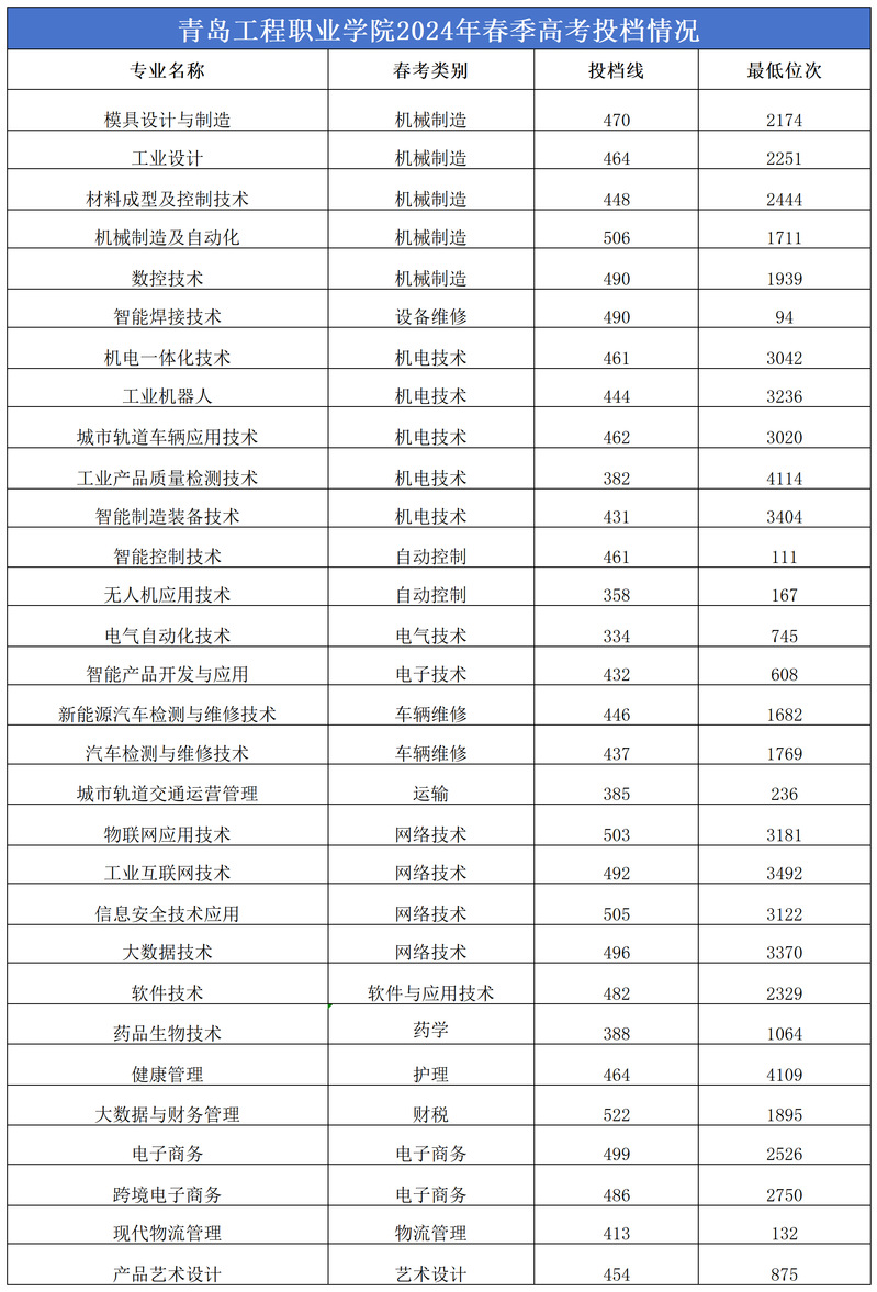 青岛工程职业学院2024年春季高考投档情况